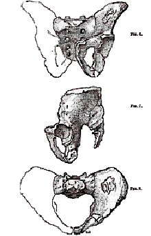 In these and all the other figures of pelvis, the front and side views are taken from the pelvis in such a position that the body of the ischium is vertical. The figures are one-fourth of the natural size.