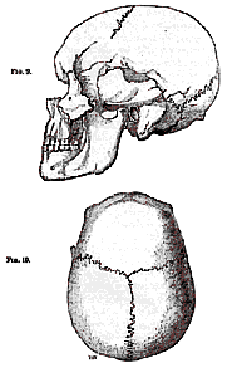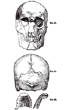 The skull is orthocephalic, the cephalic index being 0.76. The calvaria is remarkable for the projection of the supra-ciliary ridges, caused by the great development of the frontal sinuses, the prominences formed by which are separated by but a very slight median depression. The forehead is low, narrow and receding, and the median contour of the skill slopes from it, gradually upwards, towards the vertex. The occipital spine is very strong, curved, and prominent, and the cerebellar region below it, strongly convex downwards. The supra-auditory ridge and the mastoid processes are very strong, and the styloid processes seem to have been no less so.