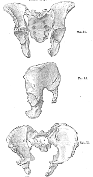 The sacrum, though it consists of only the ordinary five vertebræ is as long as it is broad, and has a well marked anterior concavity. The greater sacro-sciatic notch is not more open than usual; the true pelvis is deep, and all the ridges and tuberosities of the bones are well developed. The axes of the acetabula are directed well forwards as well as outwards (figs. 14, 15, 16).