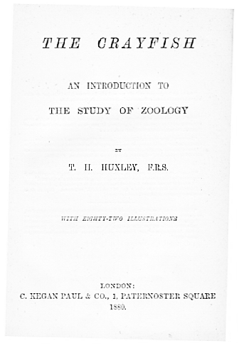 [5] My purpose, in the present work, is to exemplify the general truths respecting the development of zoological science which have just been stated by the study of a special case; and, to this end, I have selected an animal, the Common Crayfish, which, taking it altogether, is better fitted for my purpose than any other.