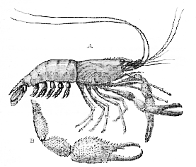 [328] Many of these fluviatile prawns differ from the marine species not only in their great size (some attaining a foot or more in length), but still more remarkably in the vast development of the fifth pair of thoracic appendages. These are always larger than the slender fourth pair (which answer to the forceps of the crayfishes); and, in the males especially, they are very long and strong, and [329] are terminated by great chelae, not unlike those of the crayfishes. Hence these fluviatile prawns (known in many places by the name of "Cammarons") are not unfrequently confounded with true crayfishes; though the fact that there are only three pair of ordinary legs behind the largest, forceps-like pair, is sufficient at once to distinguish them from any of the Astacidae.