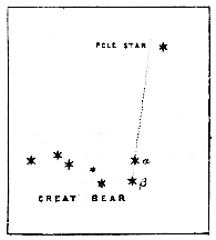 But it is by no means necessary to have daylight in order to discover the direction of the cardinal points. If you look up into the heavens on a clear starry night, you will have no difficulty, in this part of the world, in finding that curious group of seven bright stars known as Charles's Wain, forming part of the Great Bear (Fig. 1). A line drawn through two of these stars (B, a) will, if prolonged to about five times its length, pass very close to the famous Pole-star. 2 On a clear night, all the groups of stars appear to move slowly round a certain motionless point in the sky, which is the north pole of the heavens. That point of the earth which is directly opposite the celestial north pole is the north pole of the earth. If the explorers in the Alert and Discovery could have reached the north pole, they would have found the pole-star almost directly overhead. [10] It must be remembered, however, that the pole-star is not exactly at the north pole of the heavens, although very near to it. By observing the position of the pole-star, the north can be determined on a clear night as readily as the south may be determined by the sun at noon.