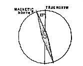 If, however, the bar be rubbed with a magnet, a peculiar change is wrought in the steel, and it no longer exhibits this indifference to direction, but, when left free, always takes up a definite position, one end pointing in a northerly and the other in a southerly, however, the bar be rubbed with a magnet, a peculiar change is wrought in the steel, and it no longer exhibits this indifference to direction, but, when left free, always takes up a definite position, one end pointing in a northerly and the other in a southerly direction. This property is taken advantage of in constructing the mariner's compass. About two hundred and twenty [11] years ago the compass pointed exactly north and south in London; but from the year 1660, or thereabouts, the end which tends northwards, and is therefore commonly called the north pole of the needle, began to turn a little to the west; this variation from true north continued until the year 1818, when it reached its greatest divergence, and since that time it has been steadily creeping back. The divergence of the position of the magnetic needle from the true north-and-south line is called its declination, or, by nautical men, its variation. In 1818 the declination amounted to nearly 25°, and in the present year (1877) it is 19° 3' in London; that is to say, the end or pole of the needle which turns in a northerly direction, instead of pointing due north, points 19° 3' to the west of true north. This declination is shown in Fig. 2. Knowing the amount of declination, it is easy to make the proper allowance and thus find the true points of the compass. By means of the compass the direction of the river in all its windings may be traced, and the course of the meandering stream laid down upon a map, as has been done, for example, in Plate I.