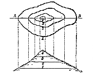 It is evident that a system of such lines conveys a far better notion of the character of the ground than can be obtained from ordinary hill-shading. Where the ground is very steep, the contour-lines run close together; where very flat, they stand far apart. The relation between the contour-lines and the form of the ground is clearly shown in Fig. 4. In the upper part of this figure, a hill is represented by contour-[15]lines; and supposing this hill were cut through, along the line A B, it would give such an outline as that drawn in the lower part of the figure, the corresponding points in the plan and the section being connected by broken lines.