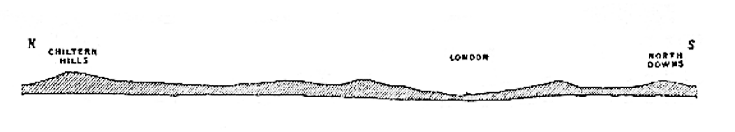 Perhaps the term "basin," just used, is one which is likely to mislead unless properly qualified. It is true that, if you go north from any part of the valley of the Thames, you find yourself sooner or later travelling up-hill, and therefore reach higher ground than that through which the river flows; if you travel southwards, you do the same thing; while towards the west, the assent is not less marked. The river then really does occupy a hollow, inclosed on three sides by high ground. But it must be borne in mind that this hollow is nothing like the deep hollow associated with our ordinary notion of a [17] basin; it is, in fact, so slight a depression that it would perhaps be better to speak of the "dish" of the Thames rather than of its "basin." In Fig 5 the undulating line indicates the general contour of the surface of the country along a north-and-south line drawn across the basin of the Thames, from the Chiltern Hills on the north, to the North Downs on the south. The very gentle curvatures of this line show the extreme shallowness of the so-called basin; and also show the irregularities in the form of the ground. Although the opposite north and south hills may attain to a height of several hundred feet above the river, yet the distance between them is so great, amounting to some fifty or sixty miles, that the rise from the river to their summits would be almost inappreciable in a diagram brought within the limits of this page. Hence it is a common practice in constructing such diagrams to draw the heights to a scale many times greater than that used for the lengths. This has, in fact, been done in Fig. 5., where the vertical is as much as twelve times greater than the horizontal scale. Without such exaggeration, the surface of the country would appear in a small diagram to be almost flat; and even with it, the extreme shallowness of the Thames basin is strikingly apparent. There is clearly no harm in the practice of drawing diagrams on this principle, provided that the exaggeration of one dimension is always acknowledged by the draughtsman, and borne in mind by the reader. Great misconception, however, constantly arises from mistaking these intentionally distorted diagrams for true figures.