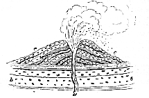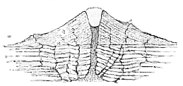 Subterranean disturbances which commence merely with quakings of the ground often terminate with the forcible ejection of heated matter from the interior of the earth. A rent may be produced at some weak point, and this crack then serves for the passage of large volumes of steam and other vapours, with showers of red-hot ashes, accompanied or followed by streams of molten rock. The solid materials are shot forth into the air, and fall in showers around the mouth of the orifice; where they form, by their accumulation, a cone-shaped mound or hill. Such a hill is called a volcano,2 or popularly a "burning mountain." It must be borne in mind, however, that it does not "burn," in the sense in which a fire burns, but it merely offers a channel through which heated matter is erupted from below. It differs again from an ordinary mountain, in that it is simply a heap of loose materials and melted matter, which has been piled up, layer after layer, around a hole leading down to the anterior of the earth. Hence, if a volcano were cut through, it would probably present a section something like that shown in Fig. 50. Here a channel, a, has been opened through strata, b, b, originally horizontal, and the ejected matter has fallen all round the orifice in conical layers, each forming a mantle thrown irregularly over the preceding layer, and sloping in all directions away from the central chimney.