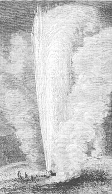 Additional evidence of the existence of heat at great depths is furnished by the temperature of the water yielded by certain springs. Some of the hot springs at Bath, for example, have a temperature of 120° F. Still hotter springs occur in many countries; and, in volcanic districts, even the boiling point is occasionally reached. The most remarkable of these hot springs are those known in Iceland as Geysers. Jets of boiling water with clouds of steam are intermittently thrown high into the air with great force and accompanied with loud explosions. The water generally holds silica in solution, as mentioned on p. 124, and this siliceous matter is deposited around the mouth of the hole as an incrustation called sinter. Although the Geysers of Iceland are best known, similar springs are found in New Zealand, and also in the Rocky Mountains of North America. Fig. 58, represents a geyser in the Yellowstone Park, described by Prof. Hayden. No fewer than 10,000 hot springs, geysers, and hot lakes are said to exist within the area of the Yellowstone Park. The geyser, here represented in action, throws jets of hot water to a height something like 200 feet.