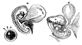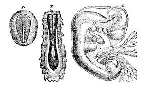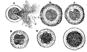 The egg, or Ovum is originally formed within a gland, from which, in due season, it becomes detached, and passes into the living chamber fitted for its protection and maintenance during the protracted process of gestation. Here, when subjected to the required conditions, this minute and apparently insignificant particle of living matter becomes animated by a new and mysterious activity. The germinal vesicle and spot cease to be discernible (their precise fate being one of the yet unsolved problems of embryology), but the yelk becomes circumferentially indented, as if an invisible knife had been drawn round it, and thus appears divided into two hemispheres (Fig. 13, C).