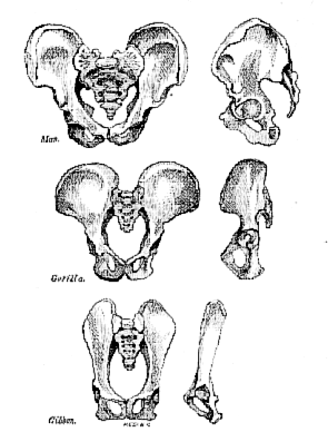 The Pelvis, or bony girdle of the hips, of Man is a strikingly human part of his organisation; the expanded haunch bones affording support for his viscera during his habitually erect posture, and giving space for the attachment of the great muscles which enable him to assume and to preserve that attitude. In these respects the pelvis of the Gorilla differs very considerably from his (Fig. 16). But go no lower than the Gibbon, and see how vastly more he differs from the Gorilla than the latter does from Man, even in this structure. Look at the flat, narrow haunch bonesthe