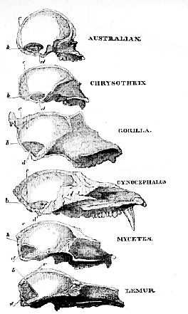 But if we consider the proportional size of the facial bones to the skull proper only, the little Chrysothrix (Fig. 17) differs very widely from the Gorilla, and, in the same way, as Man does; while the Baboons (Cynocephalus) (Fig. 17) exaggerate the gross proportions of the muzzle of the great Anthropoid, so that its visage looks mild and human by comparison with theirs. The difference