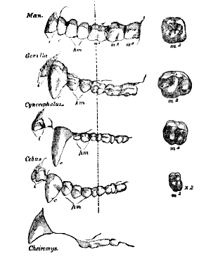 Hence it is obvious that, greatly as the dentition of the highest Ape differs from that of Man, it differs far more widely from that of the lower and lowest Apes.