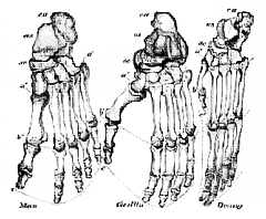 It must not be supposed, however, because I speak of these differences as not fundamental, that I wish to underrate their value. They are important enough in their way, the structure of the foot being in strict correlation with that of the rest of the organism in each case. Nor can it be doubted that the greater division of physiological labour in Man, so that the function of support is [127] thrown wholly on the leg and foot, is an advance in organization of very great moment to him; but, after all, regarded anatomically, the resemblances between the foot of Man and the foot of the Gorilla are far more striking and important than the differences.