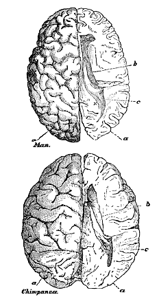 So far as cerebral structure goes, therefore, it is clear that Man differs less from the Chimpanzee or the Orang, than these do even from the Monkeys, and that the difference between the brains of the Chimpanzee and of Man is almost insignificant, when compared with that between the Chimpanzee brain and that of a Lemur.