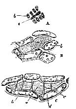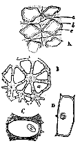 After the disappearance of the endoplast, changes commence in the periplastic substance or wall of the cell (a), more or less circular or spiral thickenings (c) taking place in it, so as to form the well-known fibre-cell of the sphagnum leaf; and at the same time, a process of resorption occurs in particular parts of the wall, so that round apertures are formed (d). Nothing can be more instructive than this case, the leaf being composed of a single layer of delicate and transparent cells, so that there are no interfering difficulties of observation; and we see demonstrated, in the most striking manner, that the endoplast or primordial utricle has nothing to do with the metamorphoses which occur in the periplastic substance. The disappearance of the primordial utricle in cells which are undergoing thickening was, in truth, long ago pointed out by Von Mohl; but neither he nor any of his successors seem to have noticed how completely this fact does away with that activity of the primordial utricle, and passivity of the cell-wall, which they all assume. We have here, in fact, the cell-wall commencing and carrying through its morphological changes after the primordial utricle has completely disappeared, and we see that the so-called secondary deposit in this case is a morphological differentiation of the periplast, which at the same time exhibits its peculiar powers by setting up a resorption of its substance at another point. Here however, we have no marked chemical differentiation; for an instance of which we may turn to the collenchyma of the beet-root (fig. 1, A). There is no question that, at one period of its development, the whole periplastic substance here, as in the Sphagnum, was homogeneous, and of the same chemical constitution. In the fully formed beet-root, however, we have no less than three compounds disposed around each cell cavity. The periplastic substance has, in fact, undergone both a chemical and a morphological differentiationthe innermost layers (c) consisting of ordinary cellulose; [270] the next of a substance which swells up in water (b); and the outermost of a different, but not exactly defined, substance (a). We may call one of these portions "cell-membrane," and another intercellular substance, but they are assuredly all nothing but differentiated portions of one and the same periplast.