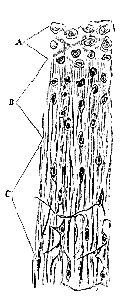 Fig. 3. Junction of tendo-Achillis and cartilage of the calcaneum in a kitten. A, Pure cartilage; B, intermediate portion; C, tendon. It must be understood that the transition is in reality much more gradual, the different stages having here been approximated for the sake of economizing space.