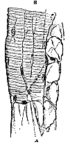 One of the most complicated of tissues is striped muscle, yet the true homology of its elements seems to us to become intelligible enough upon these principles. Dr. Hyde Salter has pointed out,19 that in the tongue the muscles pass directly into the bundles of the submucous connective tissue which serve as their tendons. We have figured such a transition in fig. 6. The tendon A may be seen passing insensibly into the muscle B, the granular sarcous elements of the latter appearing as it were to be deposited in the substance of the tendon (just as the calcareous particles are deposited in bone), at first leaving the tissue about the walls of the cavities of the endoplasts, and that in some other dimensions unaltered. These portions, which would have represented the elastic element in ordinary connective tissue, disappear in the centre of the muscular bundle, and the endoplasts are immediately surrounded by muscle, just as, in many specimens of bone, the lacunæ have no distinguishable walls. On the other hand, at the surface of the bundle the representative of the elastic element remains, and often becomes much developed as the sarcolemma. There is no question here of muscle resulting from the [276] contents of fused cells, &c. It is obviously and readily seen to be nothing but a metamorphosis of the periplastic substance, in all respects comparable to that which occurs in ossification, or in the development of tendon. In this case we might expect that as there is an areolar form of connective tissue, so we should find some similar arrangement of muscle; and such may indeed be seen very beautifully in the terminations of the branched muscles, as they are called. In fig. 7 the termination of such a muscle, from the lip of the rat, is shown, and the stellate "cells" of areolated connective tissue are seen passing into the divided extremities of the muscular bundle, becoming gradually striated as they do so.