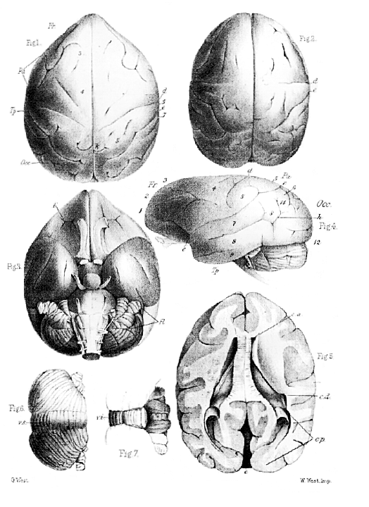 [493] The brain of a Spider Monkey (Ateles belzebuth) has already been partially described and figured by M. Gratiolet in his remarkable memoir 'Sur les Plis Cérébraux des Primatès' (1854); but this careful observer had only old spirit specimens at his disposal, and it did not enter into his plan to give any account, either of the internal structure of the cerebrum, or of its relations to the cerebellum, or of the cerebellum itself. Hence a new description, which should touch upon these points, could hardly be superfluous, under any circumstances; while, at the present moment, the controversy which has arisen respecting the nature and the extent of the differences in cerebral structure between Man and the Apes gives an especial value to all new facts.