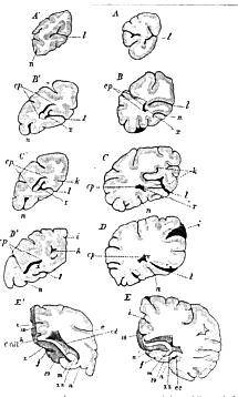 Fig. 1.Transverse sections of corresponding (left) cerebral hemispheres of Man (A, B, C, D, E) and of Ateles (A', B', C', D', E'), taken perpendicularly to the plane of the corpus callosum, along the lines marked with corresponding letters in Fig. 2. l. calcarine sulcus; n. collateral sulcus; i. calloso-marginal; k, occipito-parietal sulcus; c. p. posterior cornu; x. hippocampus minor; xx. hippocampus major. A-D, A'-D' viewed from behind; E and E' from in front.