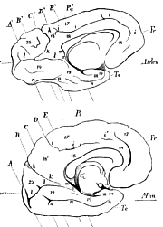 Fig. 2.View of the inner surface of the left cerebral hemisphere of Ateles, of the natural size, and beneath it a corresponding view of the human left cerebral hemisphere reduced to the same size. In the latter only the principal sulci are indicated. i. calloso-marginal sulcus; k. occipito-parietal sulcus; l. calcarine sulcus; m. dentate sulcus; n. collateral sulcus; x. continuation of the callosal gyrus (18) into the uncinate gyrus (19). A, B, C, &c., A', B', C', & c., the lines along which the transverse sections in Fig. 1 are taken.