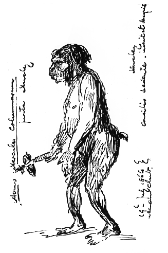 "Professor Huxley namely affirms that the fossil skull of the cave in the valley of the Düssel, is, among all skulls, admittedly belonging to an epoch anterior7 to the present, the most ape-like (2). Along with and in demonstration of this proposition, he speaks of a short sagittal suture, which, however, is no longer present, either externally or internally, and considering the dolichocephalic form of the skull must at a previous period certainly have been long (3); and further of a want of space for the posterior lobes of the cerebrum, although the calvaria exhibits a not inconsiderable arching of the upper part of the squama occipitis.(4) According to this, a homo pithecoides formerly dwelt in this rock cavern (known as the lesser "Feldhofgrotte") as a Troglodytes (5)!?