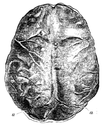 "The calvaria, indeed, possesses a solid consistence, and the hardness and smoothness peculiar to fossil bones, as well as a brownish colour, but exhibits no hyperossification; but two lamellæ with diploe [578] increasing posteriorly, so that on the lateral wall it is 2 lines thick, on the occiput 3 lines. The inner surface of the calvaria also indicates but moderate osseous development, the falx frontalis projecting but little; the falx sagittalis being entirely absent; the falx cerebelli ossea being but slightly developed, and the impressions of the central gyri, viz., two depressions on the inner lamella, corresponding to the superciliary arches and smaller impressions in the lateral wall, being still visible. The superior occipital fossa for the posterior lobe of the brain is, on the left side, deep but narrower, on the right side, broader, but flat. The groove for the arteria meningea media is still present below, but disappears above. The fossæ for the Pacchionian glands are tolerably large, especially on the right side, near the place of the sagittal suture. I may add that the fossa for the lachrymal gland on the malar process of the frontal bones of both sides is remarkably deep. Thus there is no particularly strong bony development of the skull; the disappearance of the sagittal suture externally as internally; that of the coronary suture almost wholly internally; the weakness of the lambdoid suture, further demonstrate this deficiency of bony growth. Thus far then, the characters of the fragment of the skull under discussion are not at all ape-like. Is this, however, not true of the large and broad projections of the supraciliary arches, to which so much weight is attached by Professors Schaafhausen and Huxley?
