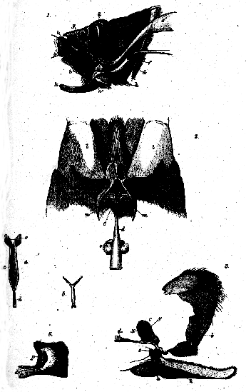 " Mouth and oesophagus.The buccal orifice appears under the form of a little transverse cleft, hidden under the cheliceræ above (au-dessus) the median appendage, which has already been described (p. 19); its edges are flexible, and are deprived of asperities. The oesophagus, which commences in a slightly funnel-shaped pharynx, is [397] delicate, short, and widened posteriorly, so as to resemble what M. Léon Dufour calls the 'jabot' in insects. The oesophagus is held upon each side, towards its middle, by a fine muscular band directed backwards, and towards its point of union with the stomach by a similar band directed forwards. These muscles are attached to the sternal floor, formed, as is known, by the basilar pieces of the appendages. They serve to stretch the oesophagus either forwards or backwards, so as to facilitate deglutition.