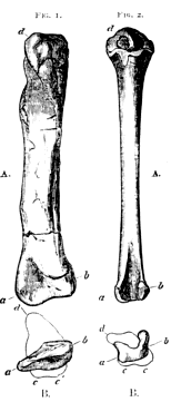 "E. D. Cope pointed out the anomalous relations existing between the tibia and the fibula in certain of the Dinosauria, as illustrated by the genus Lælaps. He remarked, the distal extremity of the tibia is transverse and much compressed, and does not exhibit any of the usual appearances of an articular surface, neither the reptilian condyle, nor a cotyloid cavity sufficient for an astragalus of the size necessary for an animal of such bulk. A bone presenting a broad hour-glass faced articular surface was discovered with the other remains, and had puzzled the anatomists who had seen it. This piece exhibits along its whole posterior aspect two faces, which form a reentrant angle for a fixed articulation; this is found to have been applied to the extremity of the tibia exactly, and to have been fixed by strong articular ligaments. The medianly constricted condyle, presenting forwards and a little downwards, exhibits so little analogy with the astragalus, as to suggest other interpretations; and after a careful examination, it seems evidently the distal extremity of the fibula. This element [477] furnishes a small articular surface at the knee, and fitting the tibia by the concavity of its inner face, becomes greatly attenuated at its distal third, where it is, in consequence of the obliquity of its direction, applied to the anterior face of the former bone. It then spreads into a plate extending to the inner margin of the tibia, while the solid shank is continued along the outer margin, and both terminate in the massive condyle, which embraces the whole extremity of the tibia like an epiphysis.