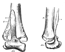 I find that the tibia and the astragalus of a Dorking fowl remain readily separable at the time at which these birds are usually brought to table. The cnemial epiphysis is also easily detached at this time. [486] If the tibia without that epiphysis and the astragalus were found in the fossil state, I know not by what test they could be distinguished from the bones of a Dinosaurian. And if the whole hind quarters, from the ilium to the toes, of a half-hatched chicken could be suddenly enlarged, ossified, and fossilized as they are, they would furnish us with the last step of the transition between Birds and Reptiles; for there would be nothing in their characters to prevent us from referring them to the Dinosauria.