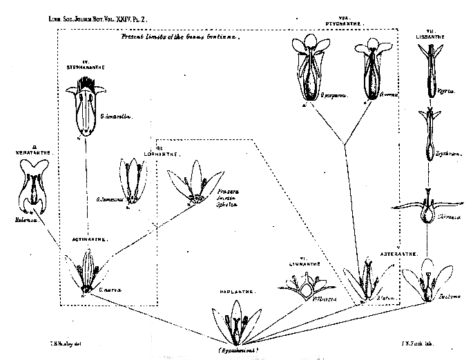 It is well-nigh forty years since I occupied myself with systematic botany and I had no works of reference at hand except Gremli's 'Flore analytique,' which I happened to have bought at Lausanne, and Rapin's 'Guide des Botanistes dans le Canton de Vaud,' which a fellow-traveller was kind enough to lend me. But the extraordinary amount of variation which presented itself when I compared considerable suites of specimens with the diagnoses and descriptions in these works struck me so much that, all '"unanointed and unannealed" as I was in systematic work, I was tempted to see what 1 could make out of the facts for myself. In truth, the Gentians took hold of me rather than I of them and I have been more or less their bondservant ever [613] since. Beginning with Gentiana purpurea, I found that I could not understand that form without knowing something about the rest of the species of Gentiana; and, by a parity of reasoning, a knowledge of Gentiana involved that of the other genera of the Gentianeæ. So that since my return to England, I have been led to make a rapid survey of the whole Order; and it is the broad results of that survey that I wish to lay before the Linnean Society.