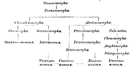 I believe that the broad outlines of such a gradational classification of Birds may be sketched out with tolerable accuracy, even though the details may have to be a good deal modified by subsequent research. Thus I take it to be demonstrated that the Tinamomorphæ are those carinate birds which approach nearest the Ratitæ; and I think it may be shown that the great majority of the Carinatæ fall into one or other of four series, which diverge directly, or indirectly, from the Tinamomorphæ as a common centre.