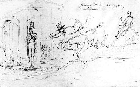 "Are you ready?" "All right, sir!" "Come on, then." And we are fairly off into the bush. Kennedy rides ahead, ever and anon taking a bearing with his pocket compass. I follow, somewhat inconvenienced at first by my carbine, and we two beat down the long grass into a road for those who come after us. We go along swimmingly at first but presently we come to a high ridge. We skirt first along one side, then the other, but there seems no end to it. We try to climb it but it is composed of vile loose blocks of stone most unsatisfactory to the shins of the climbers whether man or horse. We find it requisite to halt and Kennedy goes up to the top of the ridge with Jacky and Luff leaving two of us in charge of the horses. He is gone a long time (which I occupy by making studies of the horses in my sketchbook) and when at length he returns it is with rather a long face and the information that the ridge is not to be passed and that if it were the country round about is too thick to allow of passage in that direction.