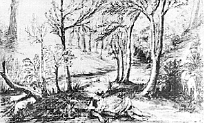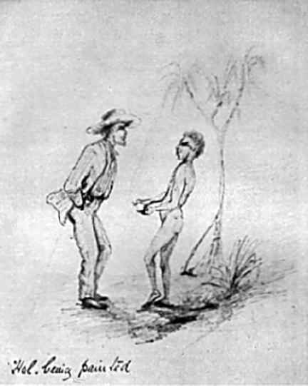 We started again and after one or two ineffectual attempts to circumvent the ridge we gave up the attempt and made our way along the sea beach to the first river. Having reached it we first attempted to follow up its left bank, but fruitlessly, as it was densely wooded with scrub. On this bank we fell in with a party of natives who immediately rushed off in great affright. They had an unfortunate child diseased in some manner so that it could only crawl on all fours. It appeared at first not to be aware of the cause of the sudden departure of its friends but suddenly perceiving us it set up a series of the most unearthly yells and scuttled off as fast it could get along. As we rode along we heard shouts and coo-eys on all sides of us without being able to see anyone. I am free to confess I was not sufficiently used to this to feel quite easy, and began to see that my pistols were handy and occasionally to speculate upon the kind of sensation that would be produced by a spear between the shoulders. But without doubt the poor wretches were far more afraid of us than inclined to disturb us. Still they did not seem to be at all badly inclined for when we returned to the mouth of the river a number on the opposite side held up their arms in sign of peace and pointed out to us the way we should follow in order to ford safely. It was fortunately low water and by keeping close to the line of breakers made by the sea dashing on the bar we crossed without wetting our horses' bellies. As we advanced our black friends retreated and beckoned to us to keep away from them. . . .