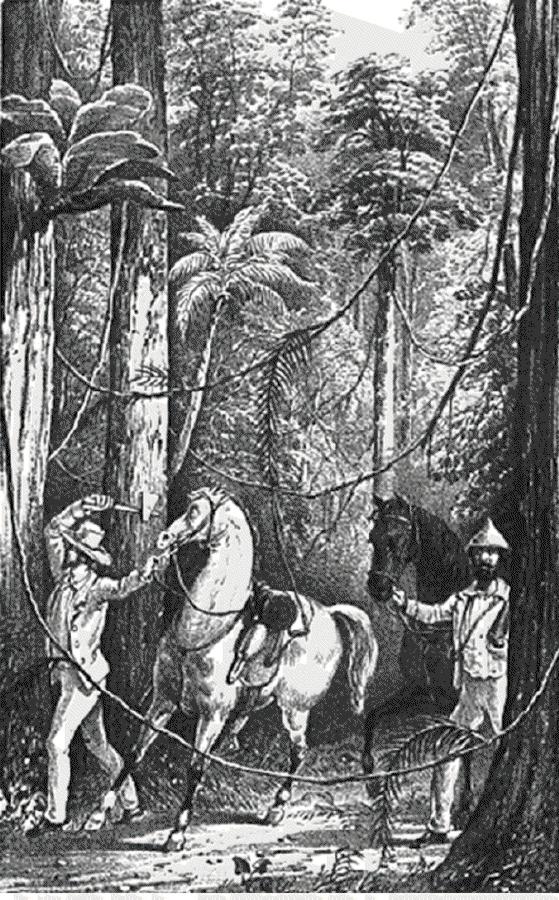 Each man had besides one or two of those inestimable quaint tin pots hanging to his beltJacky had his bush axe strapped above his cloak at his saddle bow, and one of the men led a pack horse laden with the eatables, viz., flour, damper, tea, sugar and a little salt pork that I had provided.