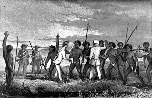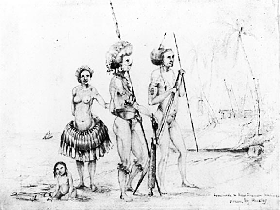 Brierly then took upon himself to do the agreeable and advanced in the same way but with such wonderful antics that the niggers seemed irresistibly attracted and committed themselves to several acts of barter. After a little while, laying my gun aside I went to them, and had a very interesting and polite interview with friend coppery and two other gentlemen who were quite black and had large fuzzy heads of hair with combs a foot long, narrow and very long-pronged, stuck into the front of their very remarkable coiffure.