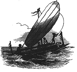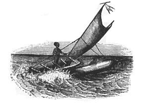 They had some of them the large bushy heads of hair of the Papuans but others were without this distinctive mark and they varied considerably in colour. For the most part they were coppery. The canoes have a single outrigger and a good deal resemble those we saw at Cape York. The sail consists of three sheets of some fibrous substance, and shortening sail is performed by taking down each sheet separately and laying it along the gunnel. The upper end of each sheet has a great many little pennants streaming from it.