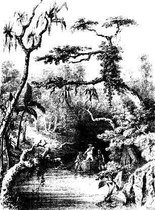 The master had found a watering place here previously and today I went up m one of the cutters. Passing over a bar you enter a narrow river bordered on each side by very high mangroves. As you go further up and the water becomes fresher these become less and less frequent, trees of all sorts arch overhead and spreading their branches across the stream impede your progress. Cutting and dodging and breaking boughs, putting the helm hard a-port to avoid this snag and hard a-starboard to get out of the way of that dead and fallen tree, you work your way up for about a mile, when suddenly turning a corner you see the water tumbling over a small rocky ridge which extends across the stream. The surrounding brush is very beautiful at this point. A dense dark mass of foliage stretches up into the sky in front, here and there relieved by the graceful bright feathery heads of palm trees or the fantastic shapes of the Pandanus, which here grow to the height of sixty feet or more, with its long pillar-like roots forming a pyramid 15-20 feet above the ground.