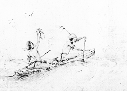 The paddles are something like the ace of spades with a long handle. They sail up near to the place they wish to reach, then strike sails, masts and all, and paddle up. The only articles of barter they brought to the Bramble were yams, cocoanuts and tortoiseshell. They were very greedy for iron and stole one of the crutches wh. happened to be lying loose on the thwart of a boat astern. Like any dexterous London thieves they passed it from hand to hand and concealed it at the far end of their canoe, and when charged with the theft looked as innocent and impassive as M. de Talleyrand himself could have looked under similar circumstances.
