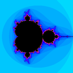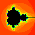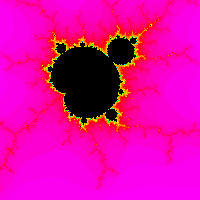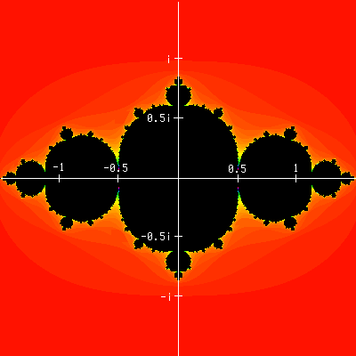 Most of the rest of the plane is colored red shading to some other colors. In this colored region of the plane, the iterates soon left toward infinity. Different colors indicate how soon, with red being quite quickly, yellow taking longer, and green, blue, and magenta taking much longer. This colored region includes the parts of the axes in the previous image that were drawn in pink.