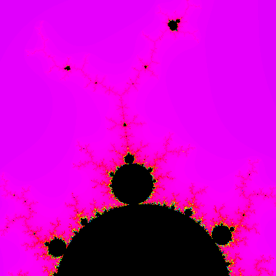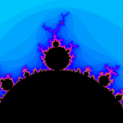 The bulk of the Mandelbrot set is the black cardioid. (A cardioid is a heart-shaped figure). It's studded with circles all around its boundary. Here's a magnification of the region of the circle on top of the cardioid. Note that this circle as well as the other circles you can see are also studded with circles. There are infinitely many circles on the cardioid, each of those circles has infinitely many circles on them, and on and on ad infinitum. That makes for a lot of circles!