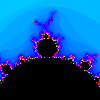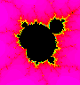 Consider a whole family of functions parameterized by a variable. Although any family of functions can be studied, we'll look at the most studied family, that being the family of quadratic polynomials f(x) = x2 - µ, where µ is a complex parameter. As µ varies, the Julia set will vary on the complex plane. Some of these Julia sets will be connected, and some will be disconnected, and so this character of the Julia sets will partition the µ-parameter plane into two parts. Those values of µ for which the Julia set is connected is called the Mandelbrot set in the parameter plane. The boundary between the Mandelbrot set and its complement is often called the Mandelbrot separator curve. The Mandelbrot set is the black shape in the picture. This is the portion of the plane where x varies from -1 to 2 and y varies between -1.5 and 1.5. There are some surprising details in this image, and it's well worth exploring.